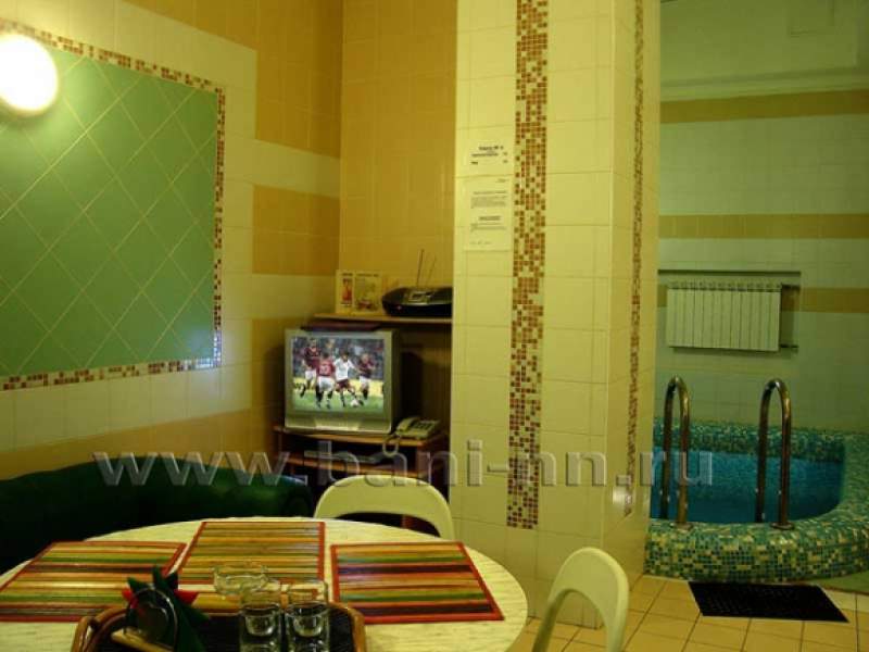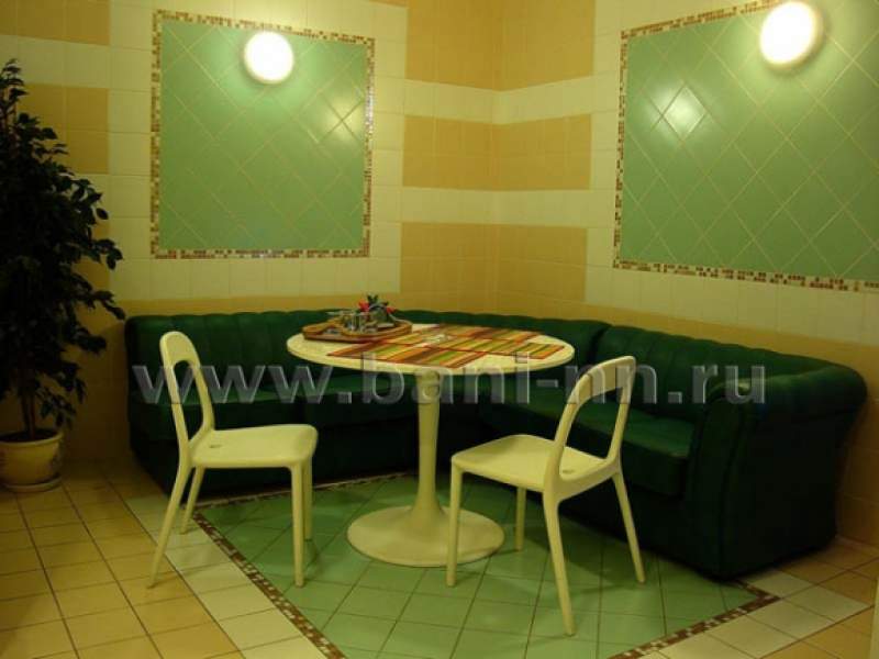 Сауна оборудована для тех, кто ценит комфорт и стиль – помещение оформлено в зеленовато-бежевых тонах, нравится самым придирчивым клиентам. В комнате зоне отдыха есть мягкие диваны, стол для дружеских посиделок, светильники, льющие приятный успокаивающий свет. Бассейн, выложенный голубой мозаикой, наполняется идеально чистой, подогреваемой до нужной температуры водой. Помещение сауны комфортабельное и уютное – оно рассчитано на четырех человек. Прогрейтесь в жаркой сауне, побеседуйте с приятелями, посмотрите телевизор или DVD, и вы почувствуете, как усталость и напряжение покидают вас, тело становится легким и подвижным, а настроение – удивительно радостным и спокойным.